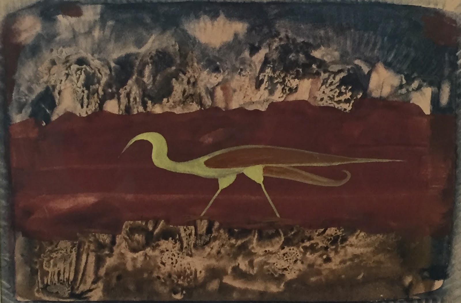 As his condition worsened, his subjects gradually changed. He started painting ghost-looking silhouettes, large-headed monsters with huge eyes, and then later small beings that look like mutants. However, from my point of view on the same 250 works and drawings around us, there was one « character » that